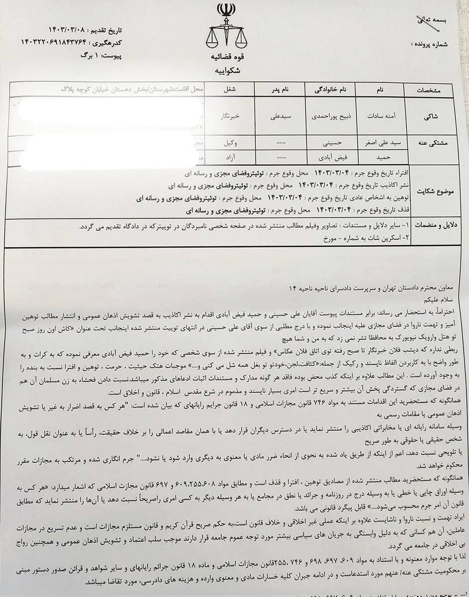 آمنه سادات ذبیح پور از نفرات احمدی نژاد شکایت کرد+سند شکایت