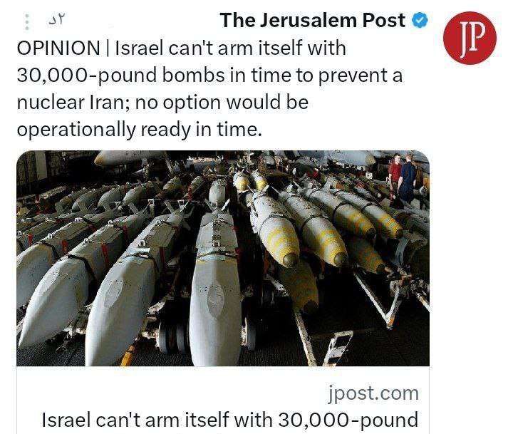 به گزارش اقتصاد ایران، اورشلیم پست نوشت: اسرائیل نمیتواند به موقع خود را به بمب های ۳۰ هزار پوندی مسلح کند تا از هسته ای شدن ایران جلوگیری کند!