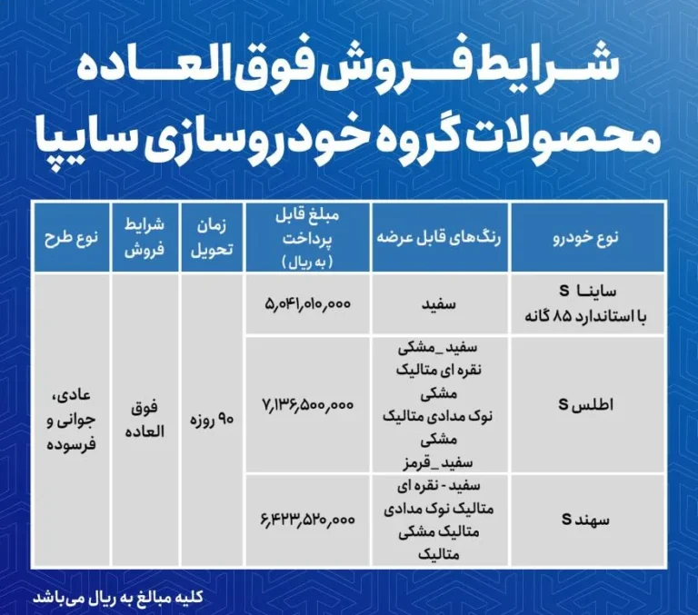 گفتنی است؛ گروه خودروسازی سایپا در بخشنامه نخست ۲ خودروی ساینا و اطلس را برای فروش اعلام کرده بود و سپس خودروی سهند را نیز به این طرح فروش اضافه کرد.