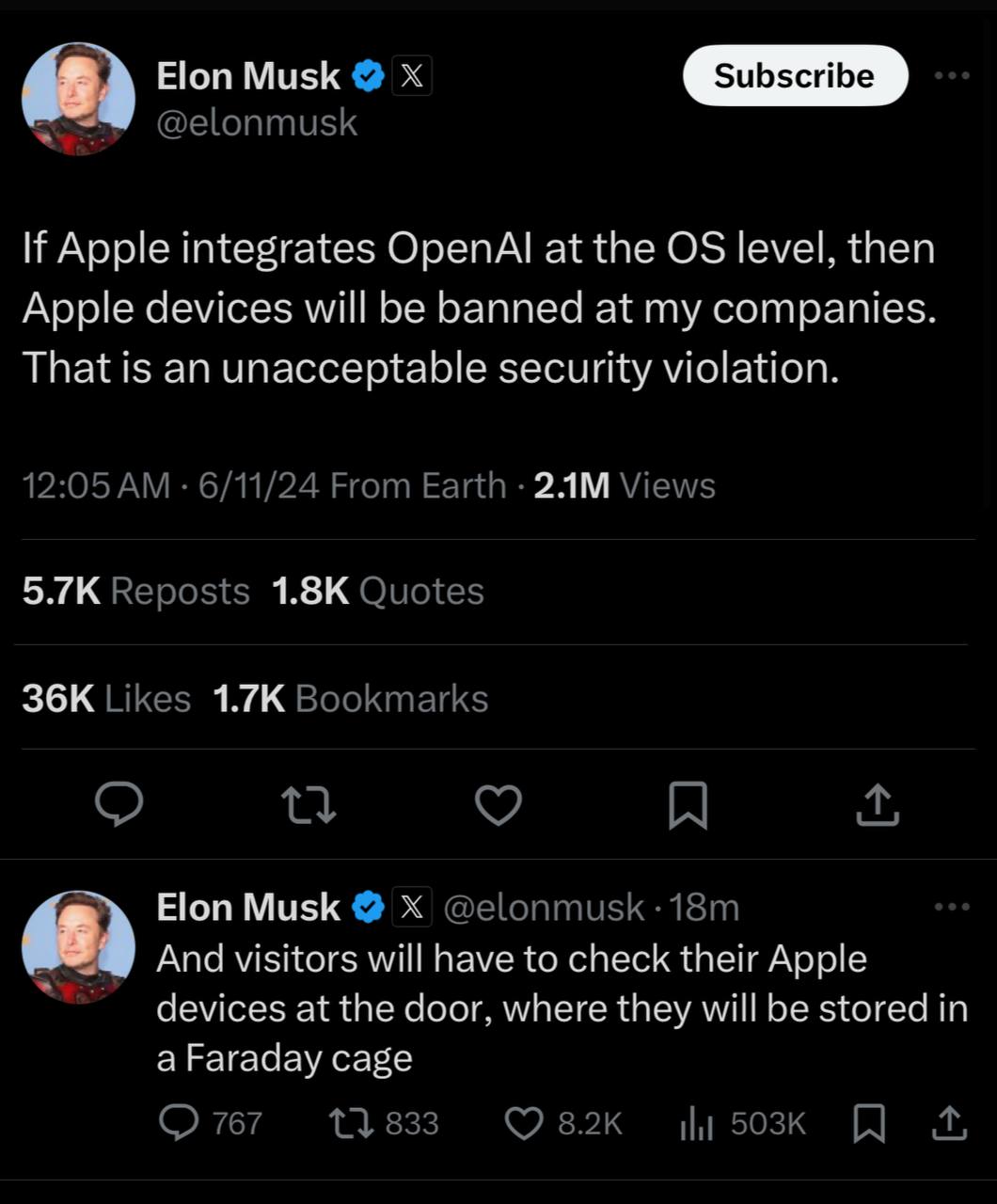 ایلان ماسک با انتشار پستی در ایکس نوشت درصورت ادغام محصولات اپل با OpenAI در سطح سیستمعامل، از ورود محصولات اپل به شرکتهای خود جلوگیری میکند.