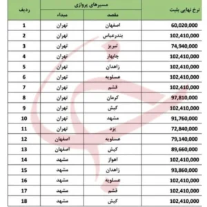 قبه گزارش تجارت ایده‌آل، بر اساس این جدول قیمت بلیت پرواز تهران مشهد به صورت رسمی به بیش از ۹ میلیون و ۱۰۰ هزار تومان رسید. همچنین بلیت پرواز تهران کیش به بیش از ۱۰ میلیون ۲۰۰ هزار تومان رسید.