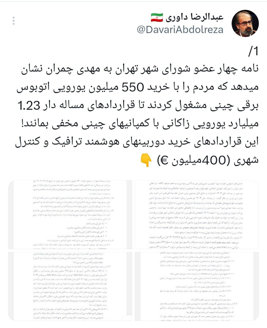 عبدالرضا داوری، فعال رسانه ای در رشته توئیتی نوشت : نامه چهار عضو شورای شهر تهران به مهدی چمران نشان می دهد که مردم را با خرید ۵۵۰ میلیون یورویی اتوبوس برقی چینی مشغول کردند تا قراردادهای مساله دار ۱.۲۳ میلیارد یورویی زاکانی با کمپانی های چینی مخفی بمانند!