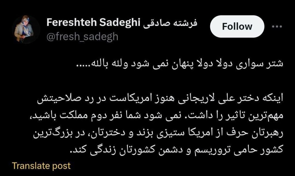 خبرنگاری به نام فرشته صادقی با یک توییت از دلیل رد صلاحیت علی لاریجانی افشاگری کرد.