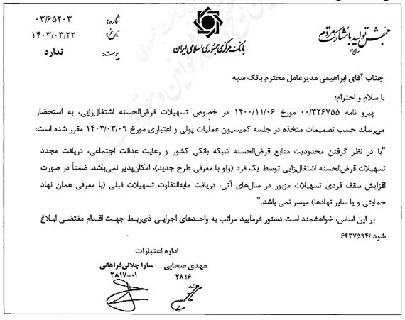 در بخشنامه بانک مرکزی آمده است: پیرو نامه ۰۰/۳۲۶۷۵۵ مورخ ۱۴۰۰/۱۱/۰۶ در خصوص تسهیلات قرضالحسنه اشتغالزایی به استحضار میرساند حسب تصمیمات متخذه در جلسه کمیسیون عملیات پولی و اعتباری مورخ ۱۴۰۳/۰۳/۰۹ مقرر شده است با در نظر گرفتن محدودیت منابع قرضالحسنه شبکه بانکی کشور و رعایت عدالت اجتماعی دریافت مجدد تسهیلات قرضالحسنه اشتغالزایی توسط یک فرد (ولو با معرفی طرح جدید) امکان پذیر نیست.