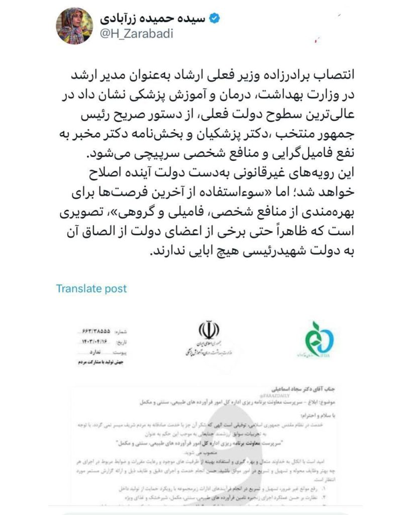 حمیده زرآبادی، سخنگوی ستاد مسعود پزشکیان در توییتر خود به انتصاب برادرزاده وزیر ارشاد در وزارت بهداشت واکنش نشان داد.
