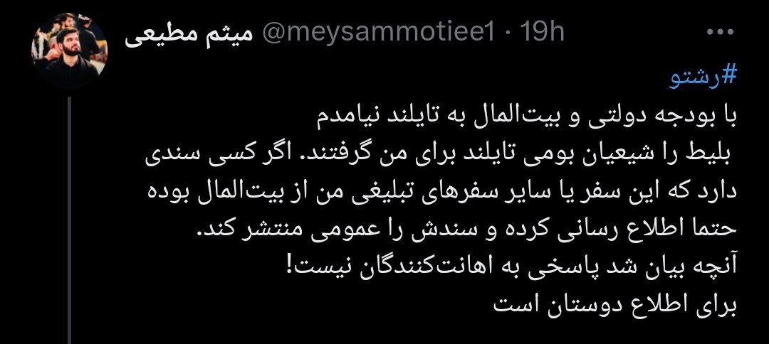 اشتراک گذاری توییتر چاپ گوناگون روشنگری مداح معروف در خصوص سفرش به تایلند میثم مطیعی مداح معروف درباره سفرش به تایلند توضیح داد و نوشت: این سفر با بودجه دولتی نیست؛ شیعیان بومی برایم بلیط گرفتند. ۱۶ شهریور ۱۴۰۳۰ به گزارش اقتصاد ایران، توضیح او را در ادامه ببینید. برچسب هامیثم مطیعی کپی لینک لینک کپی شد