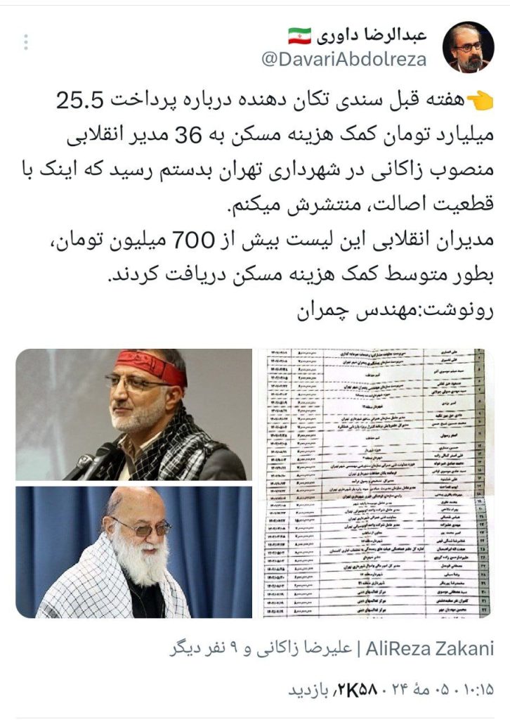 به گزارش اقتصاد ایران، عبدالرضا داوری در توئیتر نوشت: هفته قبل سندی تکان دهنده درباره پرداخت ۲۵.۵ میلیارد تومان کمک هزینه مسکن به ۳۶ مدیر از مدیران انقلابی منصوب زاکانی در شهرداری تهران بدستم رسید که اینک با قطعیت اصالت، منتشرش میکنم.
