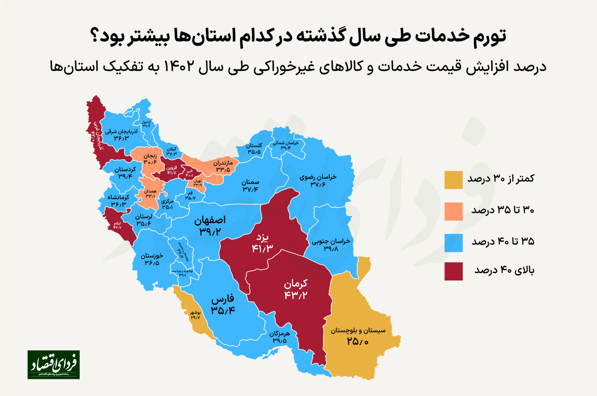 تورم مصارف غیرخوراکی و خدمات طی سال ۱۴۰۲ از ۲۵ درصد تا ۴۳ درصد در استانها متغیر بوده است.