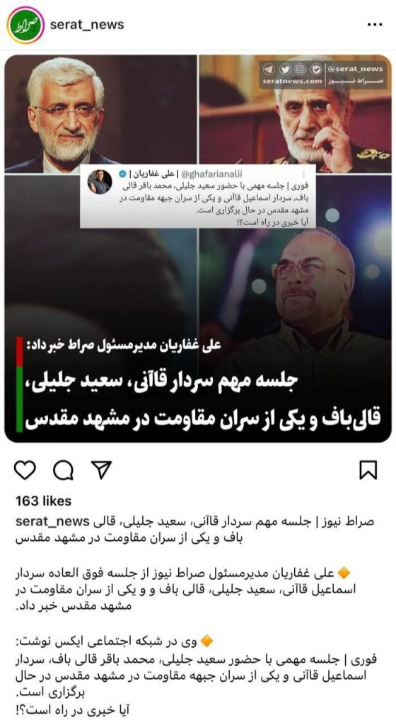 به گزارش اقتصاد ایران، علی غفاریان فعال رسانهای اصولگرا خبر از دیدار انتخاباتی قالیباف و جلیلی با حضور سردار قاآنی فرمانده نیروی قدس سپاه و یکی از سران جبهه مقاومت به منظور اجماع در جریان اصولگرایی داد.