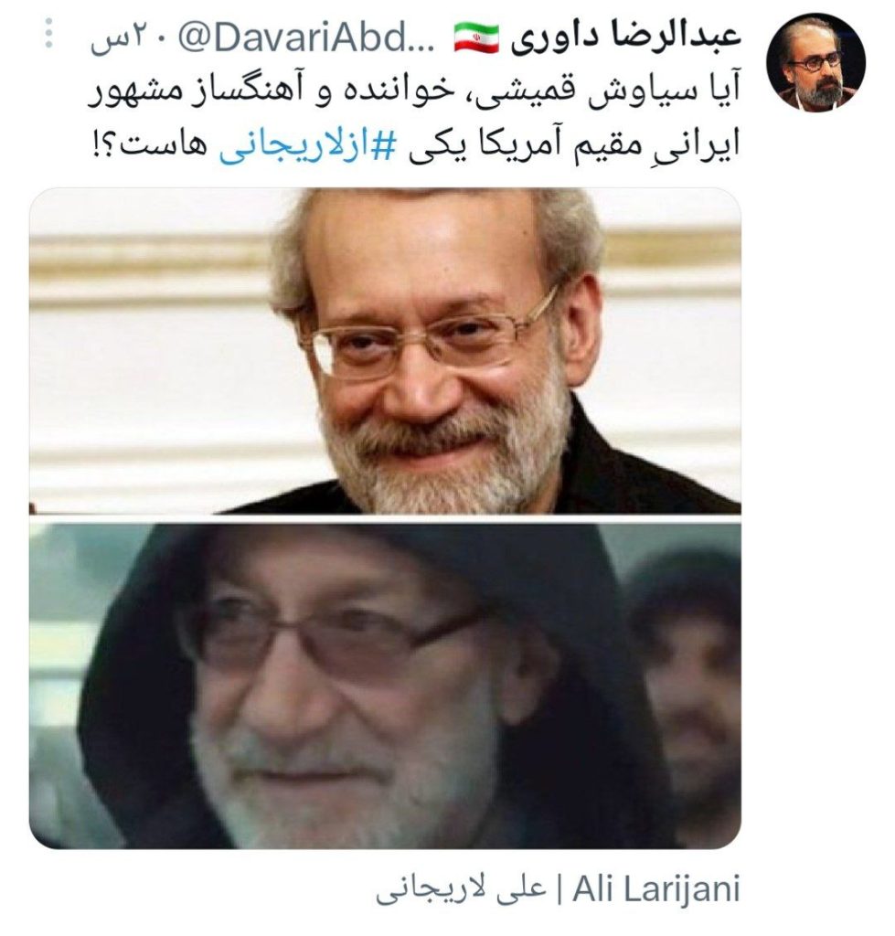 به گزارش اقتصاد ایران، عبدالرضا داوری فعال سیاسی در توئیتی از شباهت عجیب علی لاریجانی با سیاوش قمیشی خواننده لس آنجلسی خبر دارد و در این تویتت نوشت: