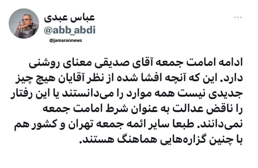 ادامه امامت جمعه آقای صدیقی معنای روشنی دارد. این که آنچه افشا شده از نظر آقایان هیچ چیز جدیدی نیست همه موارد را میدانستند یا این رفتار را ناقض عدالت به عنوان شرط امامت جمعه نمیدانند. طبعا سایر ائمه جمعه تهران و کشور هم با چنین گزارههایی هماهنگ هستند.