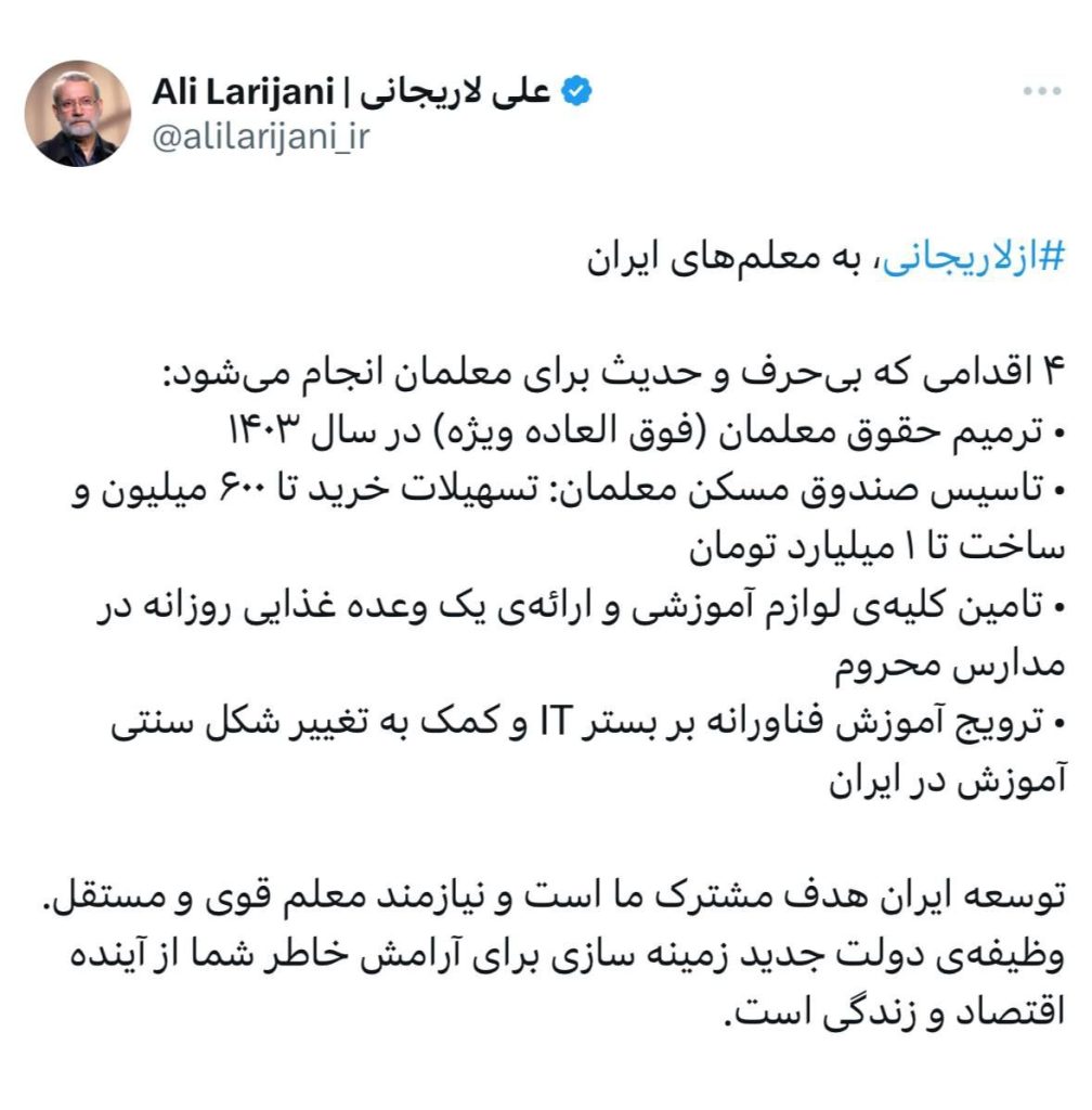 علی لاریجانی کاندیدای ریاست جمهوری به معلمهای ایران وعدههایی داده است.