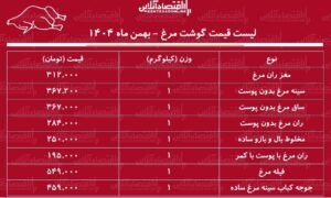 همچنین، «ران مرغ با پوست با کمر» به ازای هر کیلوگرم با قیمت ۱۹۵ هزار تومان عرضه میشود. «سینه مرغ بدون پوست» نیز برای هر کیلوگرم با قیمت ۳۶۷ هزار تومان به فروش میرسد.