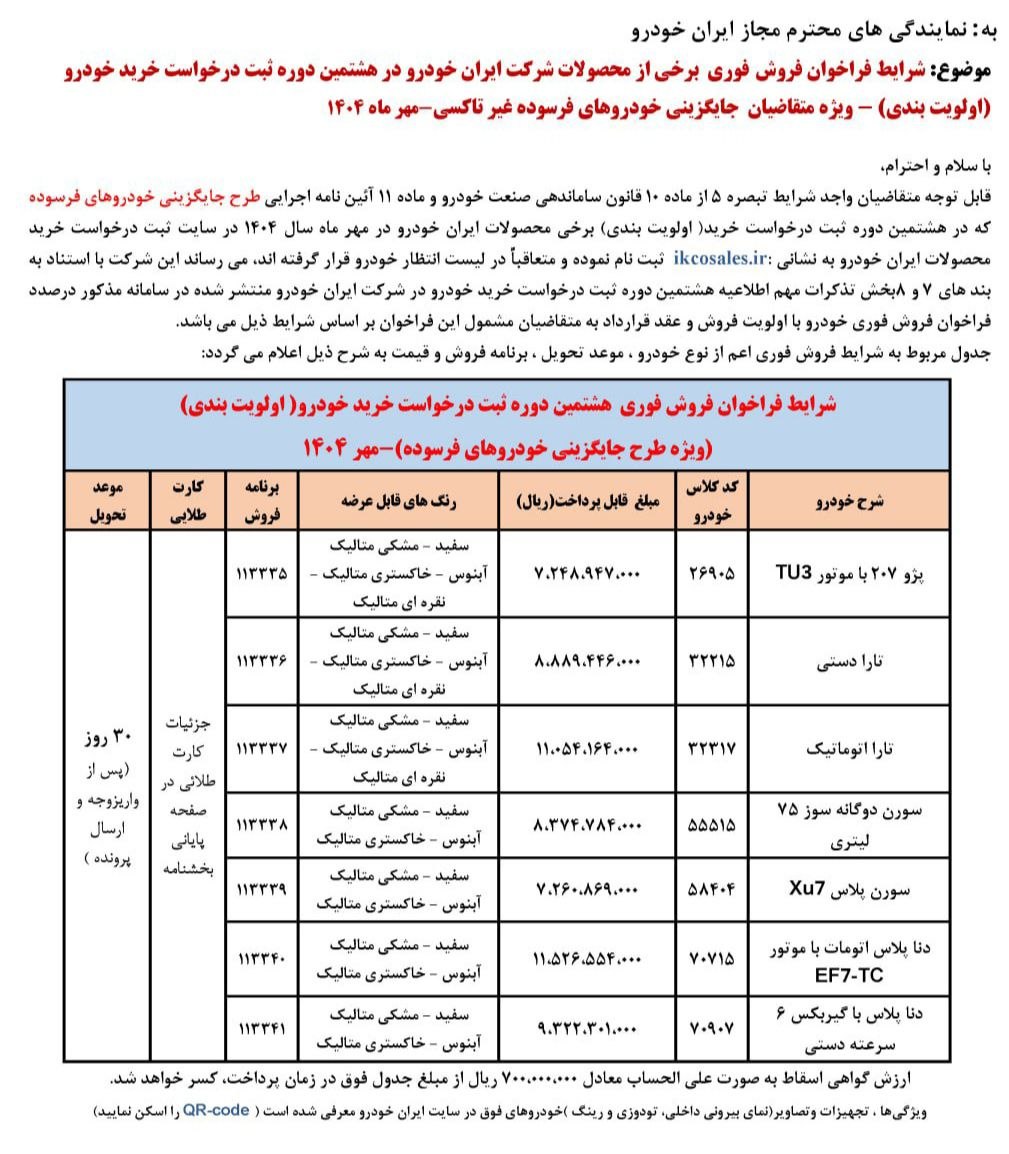 ایرانخودرو از آغاز فروش فوری مرحله هشتم طرح جایگزینی خودروهای فرسوده در مهرماه ۱۴۰۴ خبر داد.