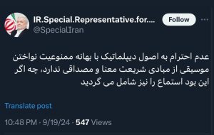 ▫️عدم احترام به اصول دیپلماتیک با بهانه ممنوعیت نواختن موسیقی از مبادی شریعت معنا و مصداقی ندارد، چه اگر این بود استماع را نیز شامل می گردید.