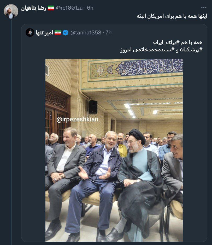 اشتراک گذاری توییتر چاپ سیاسی پسر پناهیان، خاتمی و پزشکیان را آمریکایی خواند! توییت جدید پسر پناهیان را در ادامه مشاهده می کنید. ۲۴ خرداد ۱۴۰۳۰ کپی لینک لینک کپی شد