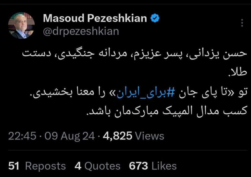 رئیس جمهور در پیامی کسب مدال نقره المپیک پاریس را به حسن یزدانی تبریک گفت.