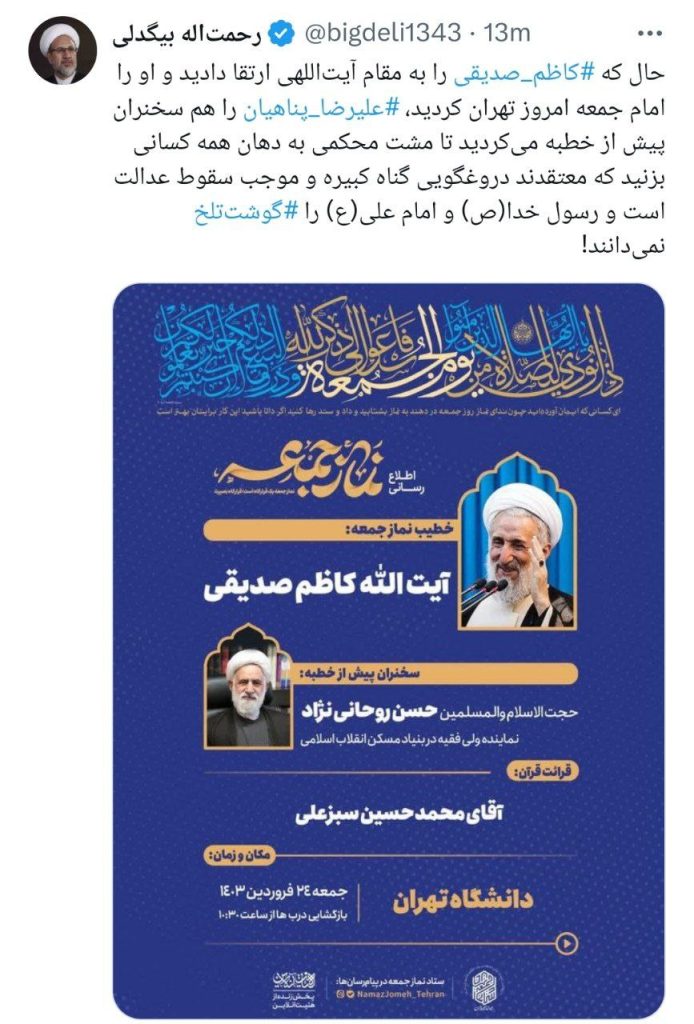 واکنش تند رحمتاله بیگدلی به حضور کاظم صدیقی در نماز جمعه امروز