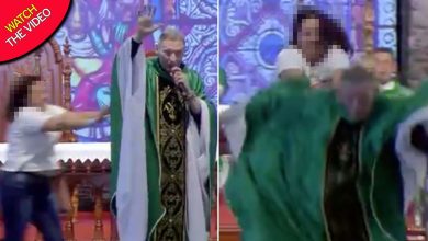 لحظه پرت کردن یک کشیش از بالای محل سخنرانی توسط یک خانم! + فیلم